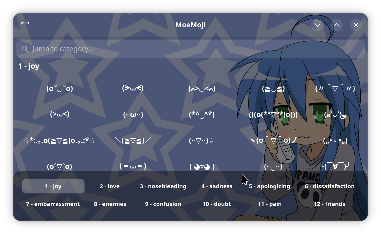 Kaomoji picker. Browse a library of Japanese emoticons, click to copy, add your own!